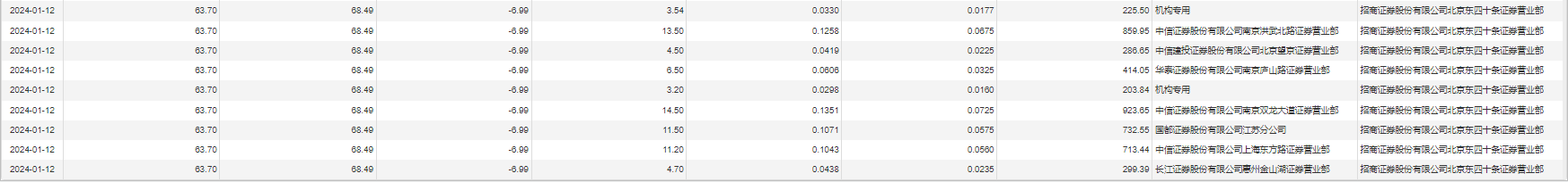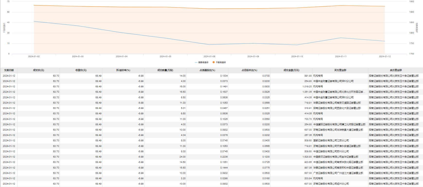 今日大宗交易成交286.49万股,成交额1.82亿元,占当日总成交额的52.67%,成交价63.7元,较市场收盘价折价6.99%。