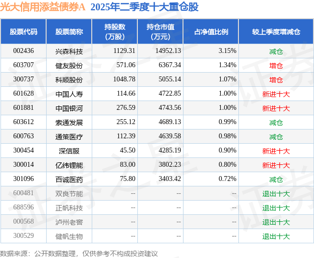 根据2025基金半年报公募基金重仓股数据,重仓该股的公募基金共3家,其中持有数量最多的公募基金为光大保德信基金的光大信用添益债券A。光大信用添益债券A目前规模为41.68亿元,最新净值1.235(9月24日),较上一交易日上涨1.23%,近一年上涨47.2%。该公募基金现任基金经理为黄波。黄波在任的基金产品包括:光大中高等级债券A,管理时间为2019年10月9日至今,期间收益率为61.34%;光大安祺债券A,管理时间为2019年10月9日至今,期间收益率为30.68%;光大增利收益债券A,管理时间为2019年10月9日至今,期间收益率为45.51%;