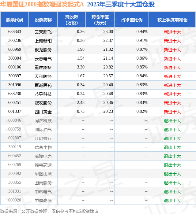 根据2025基金Q3季报公募基金重仓股数据,重仓该股的公募基金共1家,其中持有数量最多的公募基金为华夏基金的华夏国证2000指数增强发起式A。华夏国证2000指数增强发起式A目前规模为0.18亿元,最新净值1.3205(11月3日),较上一交易日上涨0.2%,近一年上涨43.45%。该公募基金现任基金经理为孙然晔。孙然晔在任的基金产品包括:华夏新机遇混合A,管理时间为2024年1月24日至今,期间收益率为47.74%;华夏创业板综合ETF,管理时间为2024年2月1日至今,期间收益率为73.99%;华夏红利量化选股股票A,管理时间为2024年7月2日至今,期间收益率为16.68%。