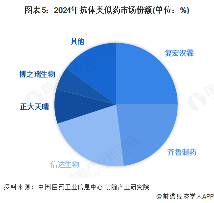 2024年抗体类似药(生物类似药中的主要类型)市场中,复宏汉霖、齐鲁制药、信达生物的市场份额均在20%以上,处于行业领先地位。