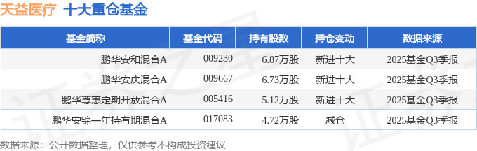 持有天益医疗最多的基金为鹏华安和混合A,目前规模为1.9亿元,最新净值1.3996(10月27日),较上一交易日上涨0.84%,近一年上涨13.62%。该基金现任基金经理为汤志彦。