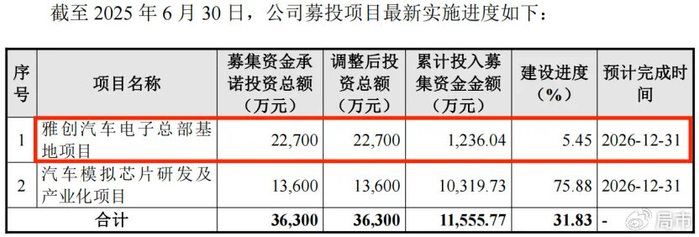 这个进度落后的“雅创汽车电子总部基地项目”,根据当时的计划,该项目中的两个部分应在2025年完成全部投资,涉及金额2.08亿元。但截至2025年中,一共只投入了1236万元。
