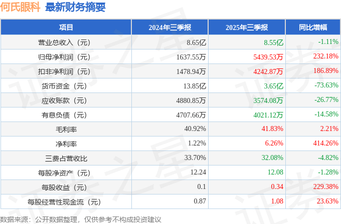 据证券之星公开数据整理,近期何氏眼科(301103)发布2025年三季报。截至本报告期末,公司营业总收入8.55亿元,同比下降1.11%,归母净利润5439.53万元,同比上升232.18%。按单季度数据看,第三季度营业总收入2.95亿元,同比上升5.37%,第三季度归母净利润1007.07万元,同比上升230.99%。本报告期何氏眼科盈利能力上升,毛利率同比增幅2.21%,净利率同比增幅414.26%。