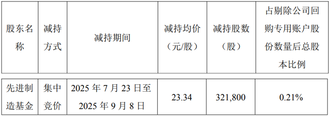 公司于近日收到持股5%以上股东先进制造产业投资基金(有限合伙)(简称“先进制造基金”)出具的《关于股份减持计划的告知函》,先进制造基金计划自公告披露之日起十五个交易日后的三个月内(即2026年2月7日至2026年5月6日期间),通过证券交易所集中竞价和大宗交易方式减持公司股份合计不超过3,106,074股,占公司总股本的1.97%(占公司剔除回购专用证券账户中股份数量后的总股本比例的2%)。