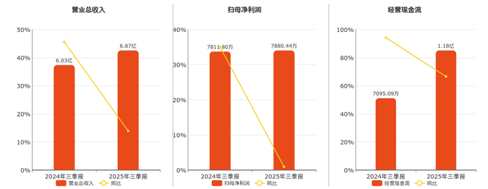公司营业总收入为6.87亿元。归母净利润为7880.44万元。经营活动现金净流入为1.18亿元。