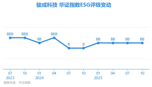 日前,华证指数公布了新一期(2025年10月31日)的ESG评级结果,骏成科技(301106.SZ)获得BB评级(华证指数评级为C起至AAA九档,C为最低档,AAA为其最高一级评级/AA为其第二档),上一期(2025年7月31日)ESG评级为BB。本期ESG评级在531家电子设备、仪器和元件行业A股上市公司中排名第205(上一期排名第183)。