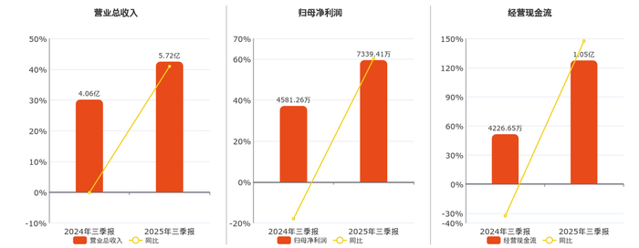 公司营业总收入为5.72亿元。归母净利润为7339.41万元。经营活动现金净流入为1.05亿元。