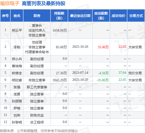 瑜欣电子近半年内的董监高及核心技术人员增减持详情如下: