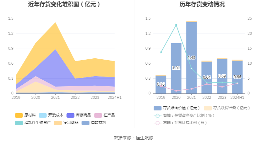 从存货变动来看,截至2024年上半年末,公司存货账面价值为6604.89万元,占净资产的3.57%,较上年末减少287.68万元。其中,存货跌价准备为230.58万元,计提比例为3.37%。