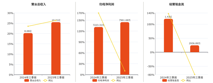 公司营业总收入为10.21亿元。归母净利润为7961.68万元。经营活动现金净流入为2936.89万元,较去年同报告期经营活动现金净流入减少1.14亿元,同比较去年同期下降79.50%。