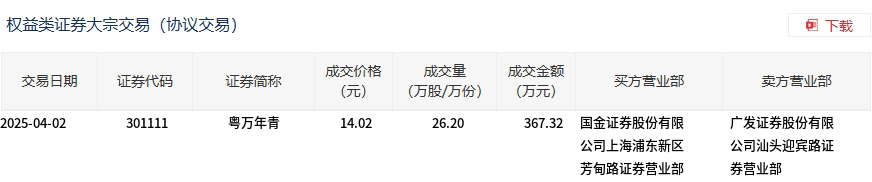 粤万年青今日大宗交易折价成交26.2万股,成交额367.32万元