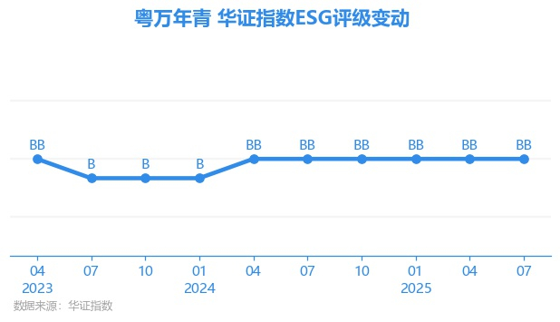 日前,华证指数公布了新一期(2025年7月31日)的ESG评级结果,粤万年青(301111.SZ)获得BB评级(华证指数评级为C起至AAA九档,C为最低档,AAA为其最高一级评级/AA为其第二档),上一期(2025年4月30日)ESG评级为BB。本期ESG评级在255家制药行业A股上市公司中排名第93(上一期排名第97)。