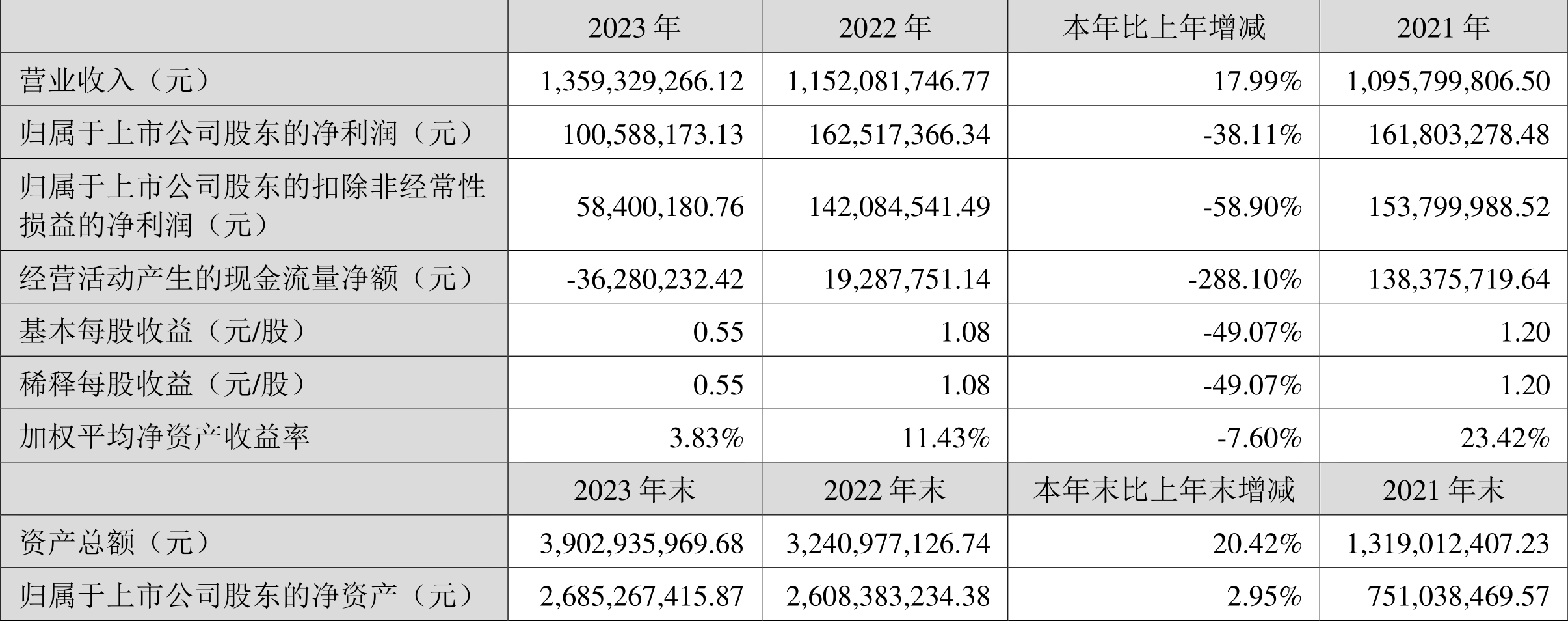 数据显示,2023年公司加权平均净资产收益率为3.83%,较上年同期下降7.60个百分点;公司2023年投入资本回报率为3.77%,较上年同期下降5.42个百分点。