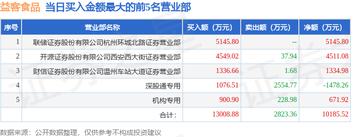 11月19日益客食品(301116)龙虎榜数据:机构净买入849.75万元,北向资金净卖出1478.26万元