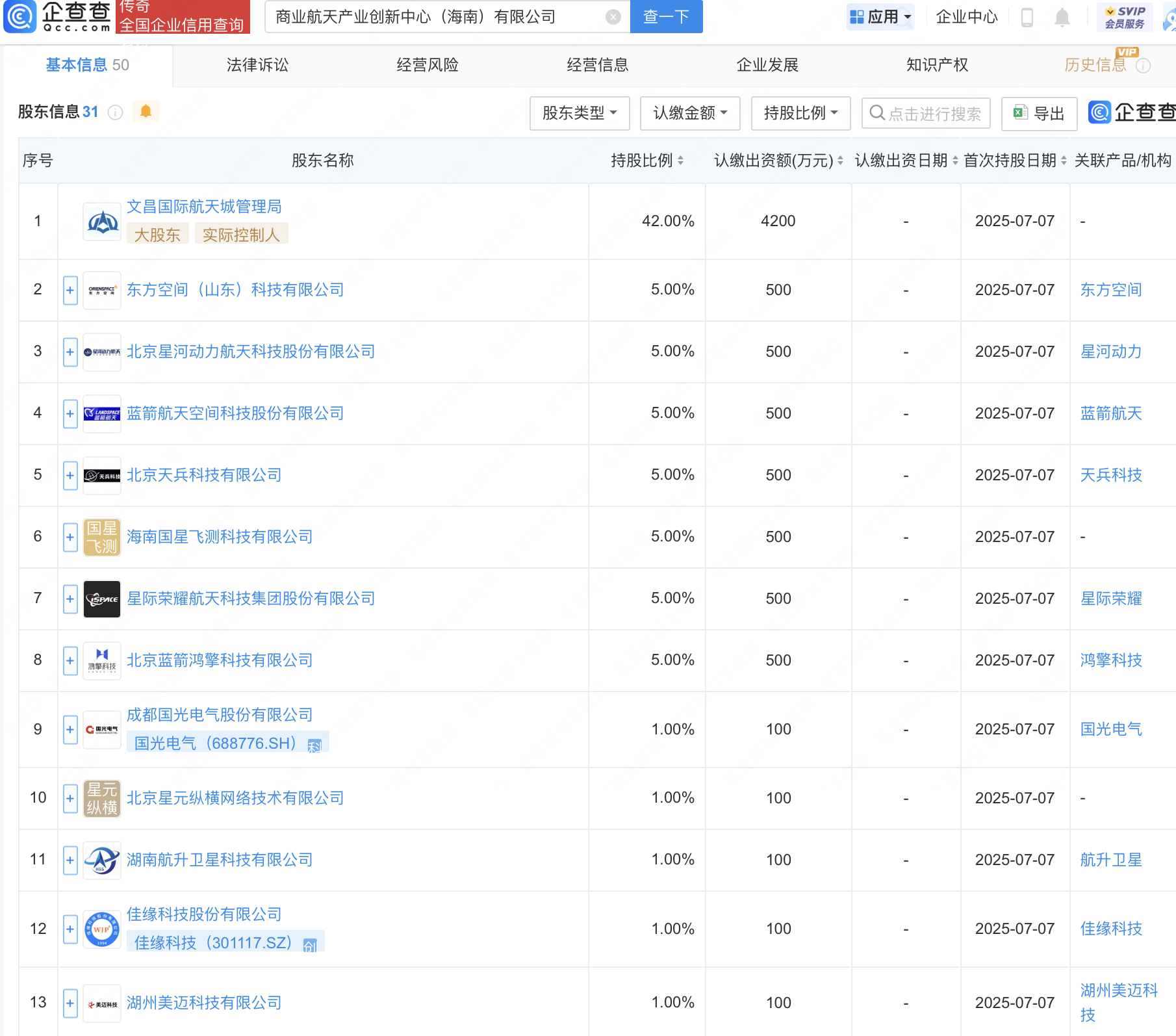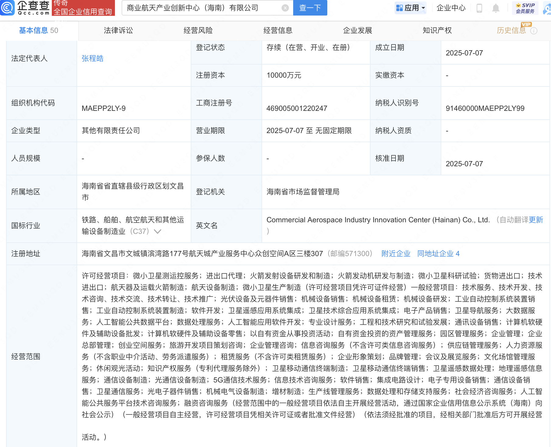 企查查APP显示,近日,商业航天产业创新中心(海南)有限公司成立,注册资本1亿元,经营范围包含:微小卫星测运控服务;进出口代理;火箭发射设备研发和制造;火箭发动机研发与制造;微小卫星科研试验等。企查查股权穿透显示,该企业由国光电气(688776)、佳缘科技(301117)、思科瑞(688053)等共同出资。