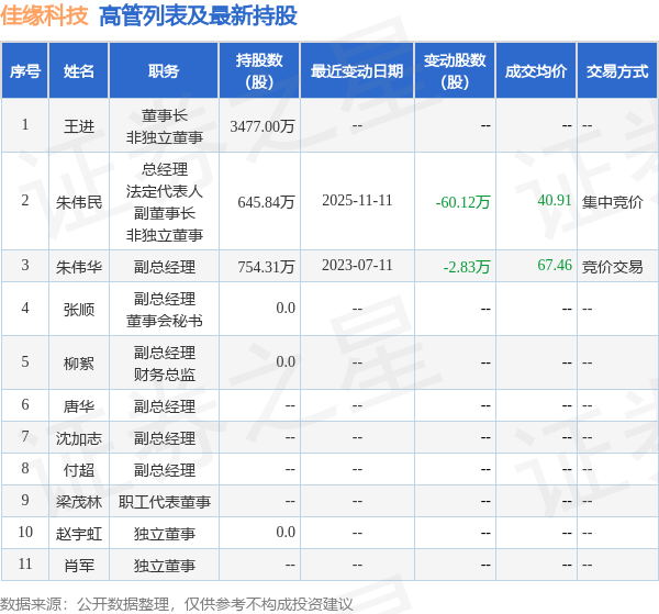 佳缘科技近半年内的董监高及核心技术人员增减持详情如下:
