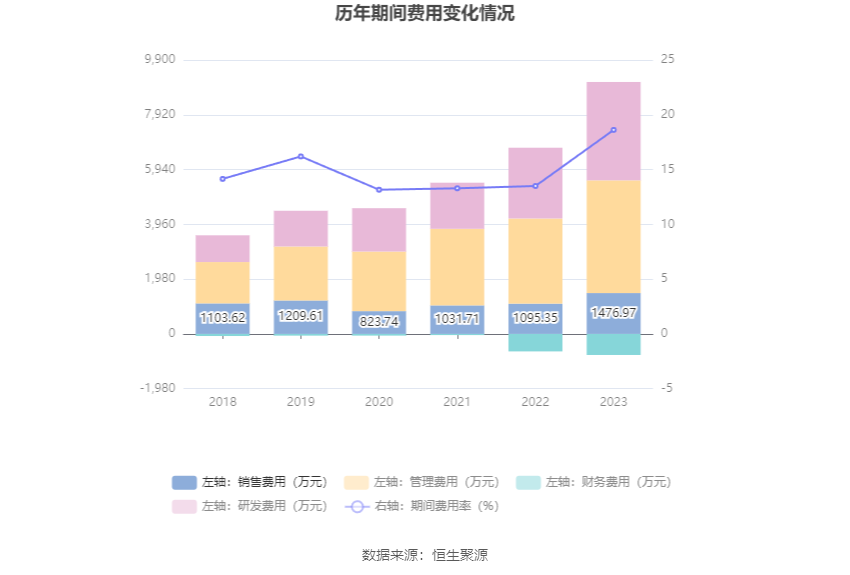 2023年,公司期间费用为8344.94万元,较上年同期增加2246.43万元;期间费用率为18.62%,较上年同期上升5.12个百分点。其中,销售费用同比增长34.84%,管理费用同比增长32.41%,研发费用同比增长38.99%,财务费用由去年同期的-631.34万元变为-760.83万元。
