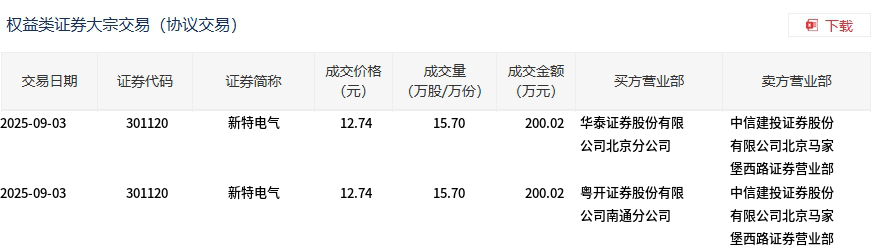 新特电气今日大宗交易折价成交31.4万股,成交额400.04万元