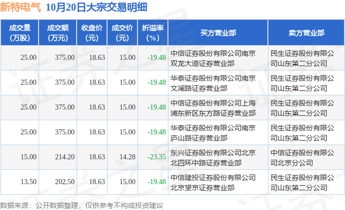 10月20日新特电气现1笔折价23.35%的大宗交易 合计成交1916.7万元