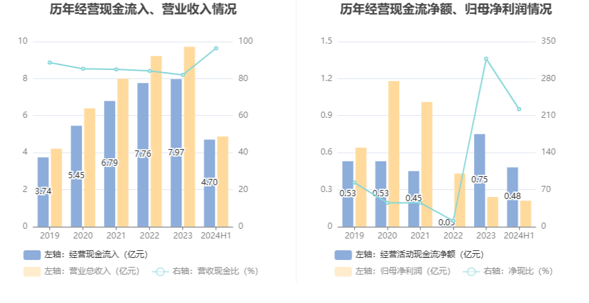 2024年上半年,公司营业收入现金比为96.41%,净现比为222.22%。