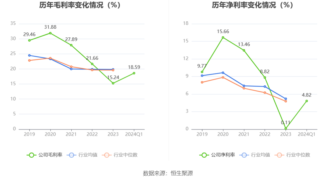 2024年第一季度,公司毛利率为18.59%,同比下降0.67个百分点;净利率为4.82%,较上年同期下降1.26个百分点。