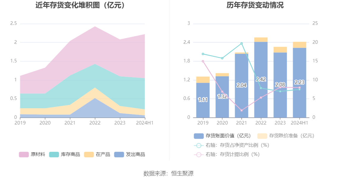 从存货变动来看,截至2024年上半年末,公司存货账面价值为2.23亿元,占净资产的7.5%,较上年末增加1469.03万元。其中,存货跌价准备为1933.29万元,计提比例为7.99%。