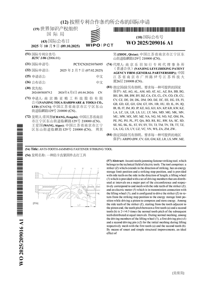 腾亚精工公布国际专利申请:“一种防卡齿紧固件击打工具”