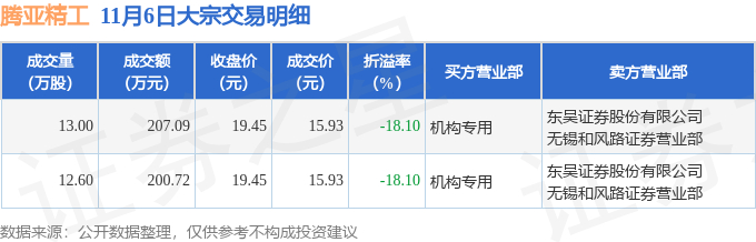 11月6日腾亚精工现2笔折价18.1%的大宗交易 合计成交407.81万元