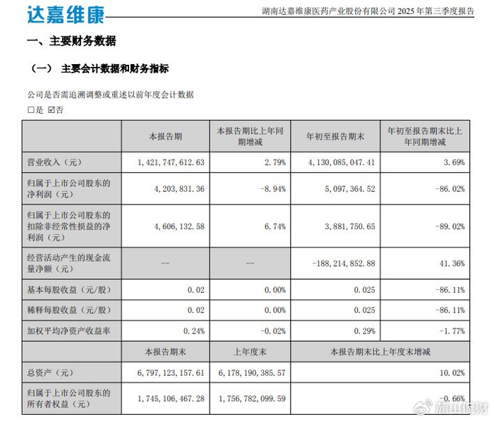 达嘉维康的2025年第三季度业绩报告中,归属于上市公司股东的净利润仅509.74万元,同比大幅下降86.02%,盈利能力已逼近盈亏临界点,扣非归母净利润更是惨跌至388.18万元,延续了近年来收入与利润背道而驰的尴尬态势。
