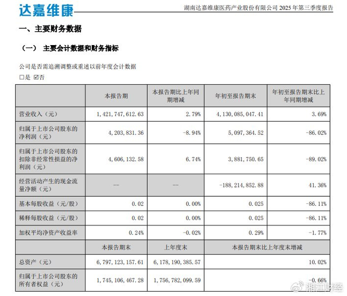 达嘉维康的2025年三季报,呈现出一组矛盾的财务数据:营业收入同比增长3.69%,达到41.3亿元,但归母净利润却暴跌86.02%,仅剩509.74万元。