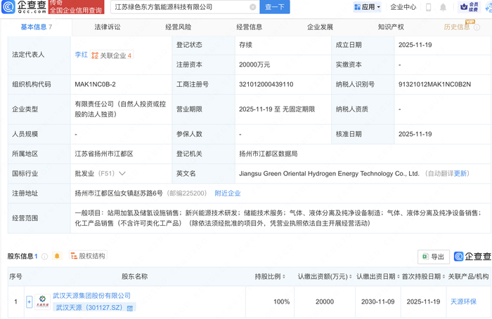 企查查APP显示,近日,江苏绿色东方氢能源科技有限公司成立,注册资本2亿元,经营范围包含:站用加氢及储氢设施销售;新兴能源技术研发;储能技术服务;气体、液体分离及纯净设备制造等。企查查股权穿透显示,该公司由武汉天源(301127)全资持股。