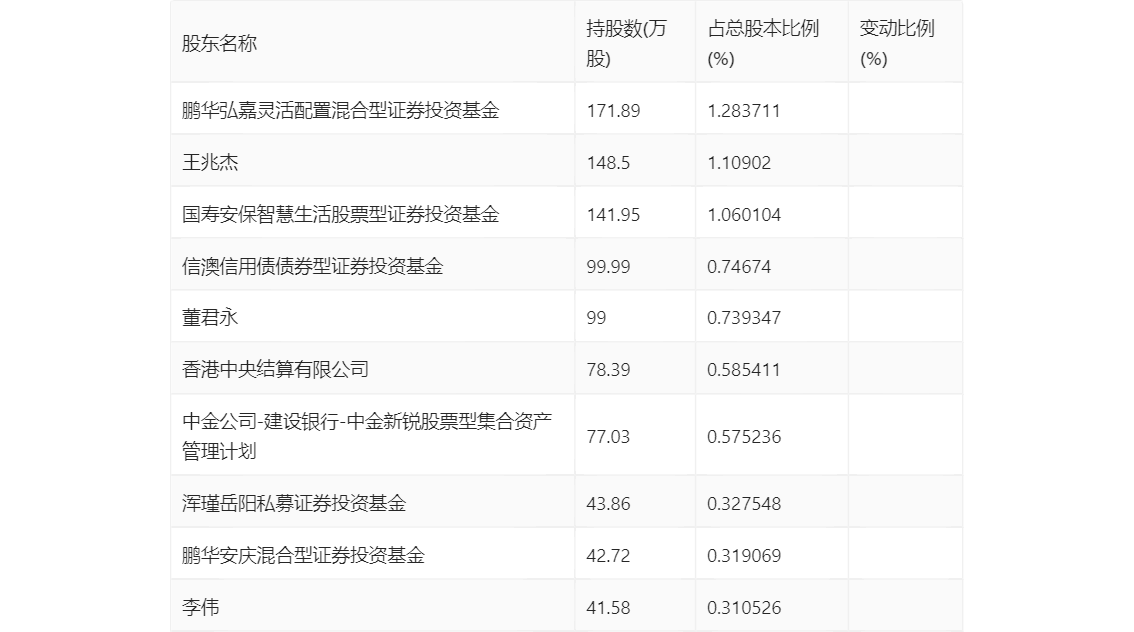年报显示,2023年年末公司十大流通股东中,新进股东为香港中央结算有限公司、浑瑾岳阳私募证券投资基金,取代了三季度末的华夏数字经济龙头混合型发起式证券投资基金、华夏鸿阳6个月持有期混合型证券投资基金。在具体持股比例上,国寿安保智慧生活股票型证券投资基金、信澳信用债债券型证券投资基金、李伟持股有所上升,鹏华弘嘉灵活配置混合型证券投资基金持股有所下降。