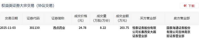 11月3日,西点药业大宗交易成交8.22万股,成交额203.75万元,占当日总成交额的4.5%,成交价24.78元,较市场收盘价30.98元折价20.01%。