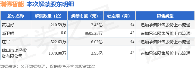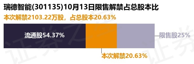 瑞德智能(301135)2103.22万股限售股将于10月13日解禁,占总股本20.63%