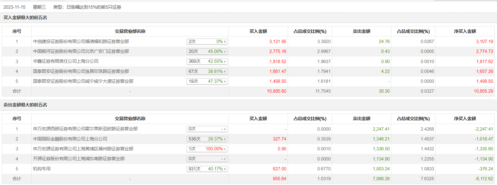 元道通信11月15日涨停,全天换手率达30.9%,振幅达11.76%。龙虎榜数据显示,营业部席位合计净买入4742.67万元。其中,机构买入627.0万元,卖出1003.24万元,合计净卖出376.24万元。此外,中信建投证券福清福和路证券营业部、中国银河证券北京广安门证券营业部分别买入3131.95万元、2775.16万元;申万宏源西部证券有限公司霍尔果斯亚欧路证券营业部、中国国际金融上海分公司分别卖出2247.41万元、1346.21万元。