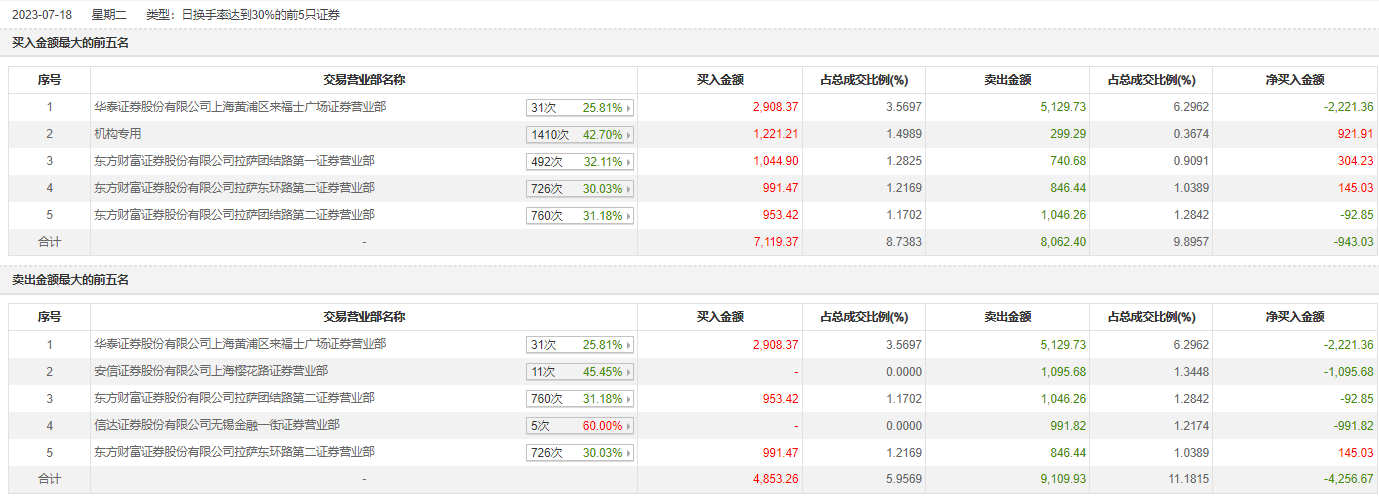 具体来看,机构买入1221.21万元,卖出299.29万元,合计净买入921.91万元。此外,华泰证券上海黄浦区来福士广场证券营业部、东方财富证券拉萨团结路第一证券营业部分别买入2908.37万元、1044.90万元;华泰证券上海黄浦区来福士广场证券营业部、安信证券上海樱花路证券营业部分别卖出5129.73万元、1095.68万元。
