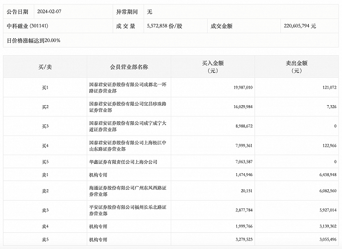 2月7日,中科磁业今日涨停,全天换手率达26.01%,振幅达22.39%。龙虎榜数据显示,营业部席位合计净买入4482.61万元。其中,机构买入675.42万元,卖出1263.37万元,合计净卖出587.95万元。此外,国泰君安证券成都北一环路证券营业部、国泰君安证券宜昌珍珠路证券营业部分别买入1998.70万元、1603.00万元;海通证券广州东风西路证券营业部、平安证券福州长乐北路证券营业部分别卖出608.26万元、592.70万元。