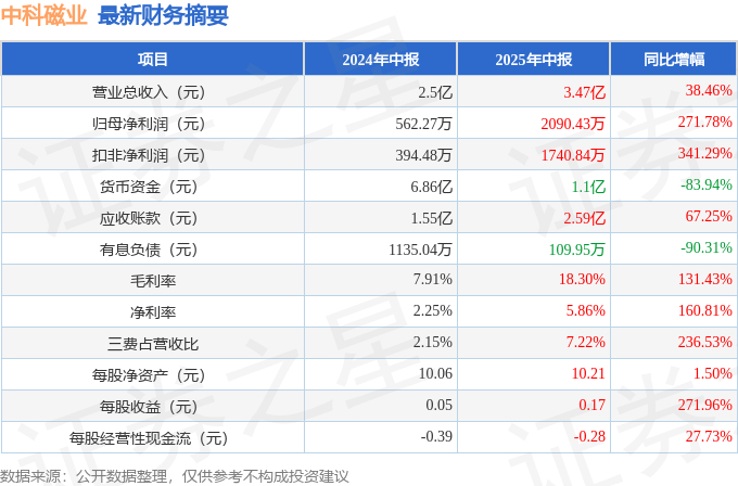 中科磁业(301141)2025年中报简析:营收净利润同比双双增长,应收账款上升