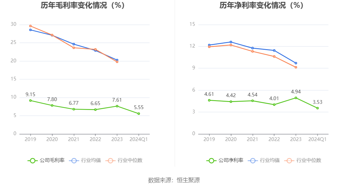 2024年第一季度,公司毛利率为5.55%,同比下降2.52个百分点;净利率为3.53%,较上年同期下降1.40个百分点。
