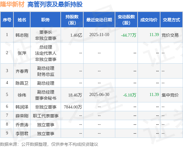 隆华新材近半年内的董监高及核心技术人员增减持详情如下: