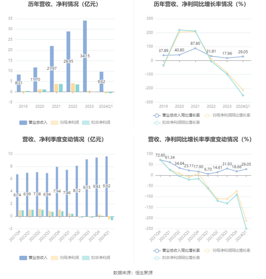 2024年第一季度,公司毛利率为0.35%,同比下降12.98个百分点;净利率为-5.21%,较上年同期下降11.20个百分点。