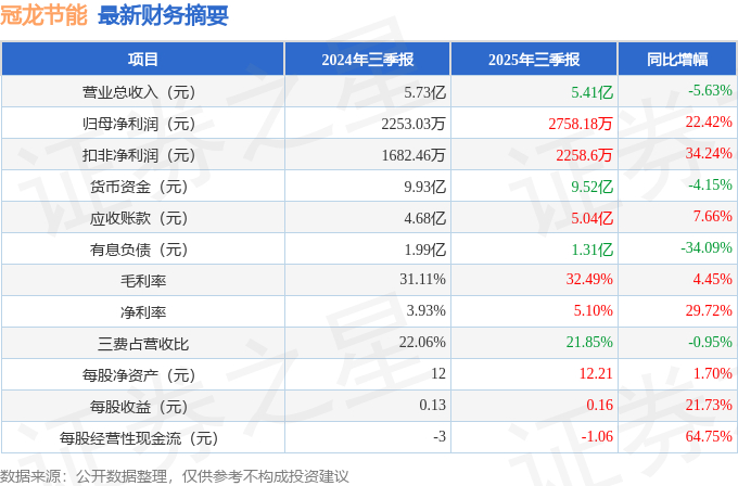 据证券之星公开数据整理,近期冠龙节能(301151)发布2025年三季报。截至本报告期末,公司营业总收入5.41亿元,同比下降5.63%,归母净利润2758.18万元,同比上升22.42%。按单季度数据看,第三季度营业总收入1.91亿元,同比下降2.33%,第三季度归母净利润889.67万元,同比下降8.16%。本报告期冠龙节能盈利能力上升,毛利率同比增幅2.27%,净利率同比增幅29.72%。