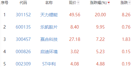 其中,天力锂能、乐凯胶片、赢合科技、启迪环境和ST中利位列板块涨幅前五位,涨幅分别为20.00%、9.95%、7.22%、5.23%和4.88%。