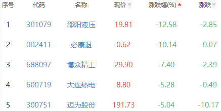 邵阳液压、必康退、博众精工、大连热电和迈为股份位列涨幅榜后五位,涨幅分别为-12.58%、-10.14%、-7.40%、-5.28%和-5.04%。