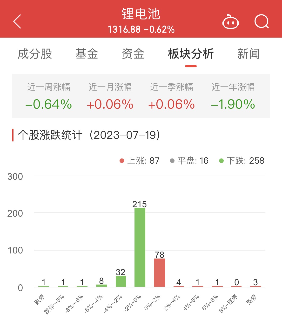中国经济网北京7月19日讯今日,锂电池板块整体涨幅-0.62%,其中87只股票上涨,16只股票平盘,258只股票下跌。