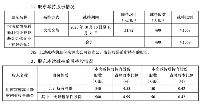 2025年10月10日至10月31日,富德基金通过大宗交易减持股份490万股,减持均价31.72元/股。持有公司股份比例从4.55%下降至0.42%,截至2025年11月10日,富德基金本次减持计划期限已届满。