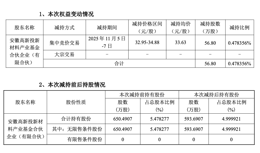 2025年11月5日-7日,新材料基金通过集中竞价方式累计减持公司股份56.80万股,减持均价33.63元/股,持有公司股份比例从5.478277%下降至4.999921%,持股比例降至5%以下,且其股份变动触及1%的整数倍。