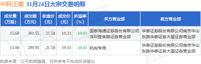 11月24日中科江南现2笔折价10.43%的大宗交易 合计成交591.5万元