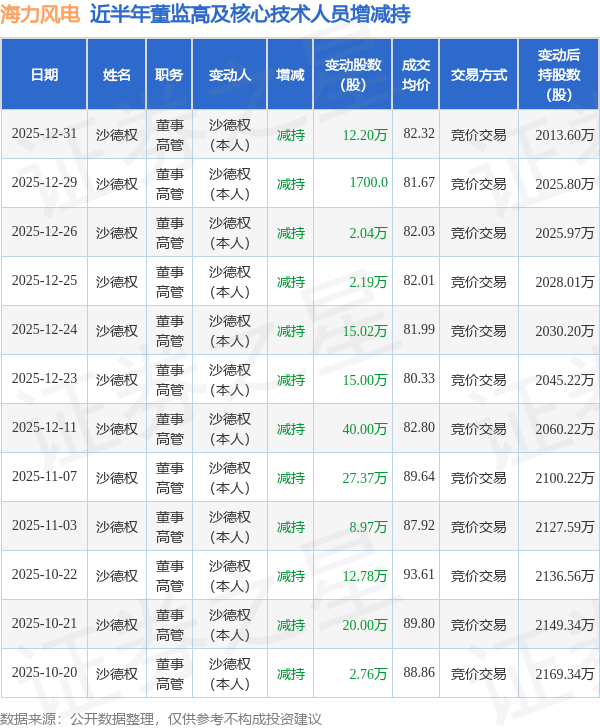 海力风电:12月31日高管沙德权减持股份合计12.2万股