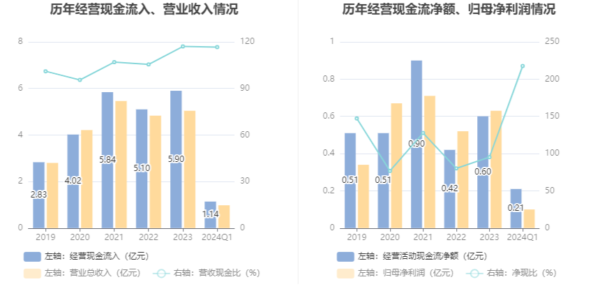 2024年第一季度,公司营业收入现金比为116.63%,净现比为217.60%。
